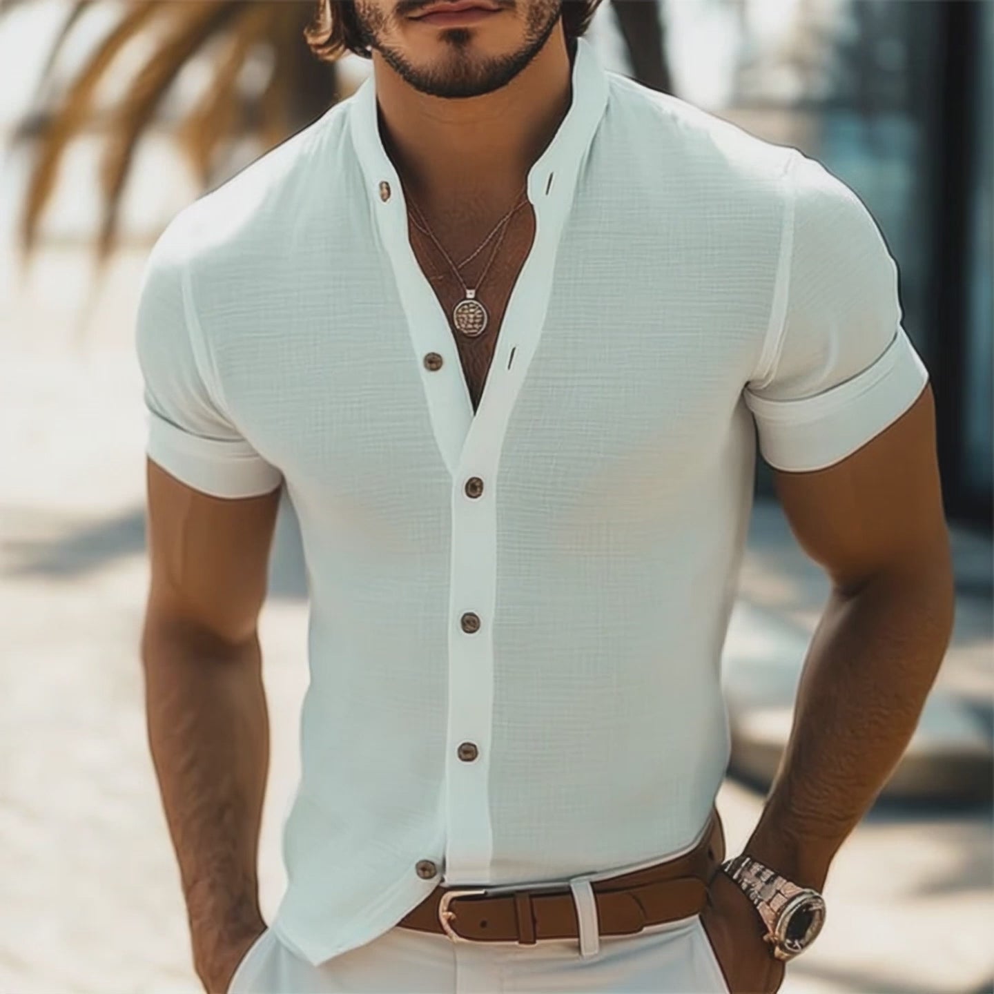 Elevate your summer wardrobe with our Men's Summer Basic Stand Collar Textured Short Sleeve Shirt. This shirt is designed to offer a blend of sophistication and relaxed style, making it an ideal choice for warm-weather occasions. Whether you're heading to a casual work setting, a beachside dinner, or a weekend getaway, this shirt promises to keep you looking sharp and feeling comfortable.