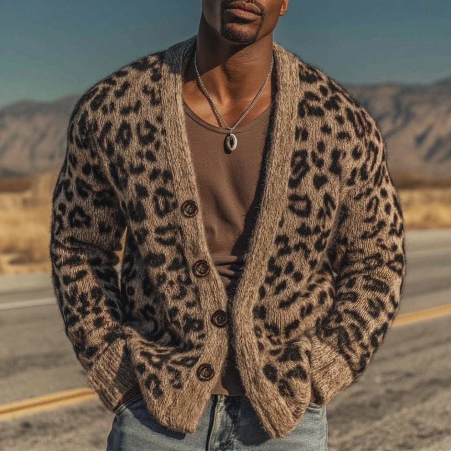 This Men's Urban Warm Khaki Leopard Print Button-Down Cardigan is a standout piece that combines modern urban style with a touch of wild flair. Designed in a sophisticated khaki color adorned with a striking leopard print, this cardigan brings a unique edge to your wardrobe.