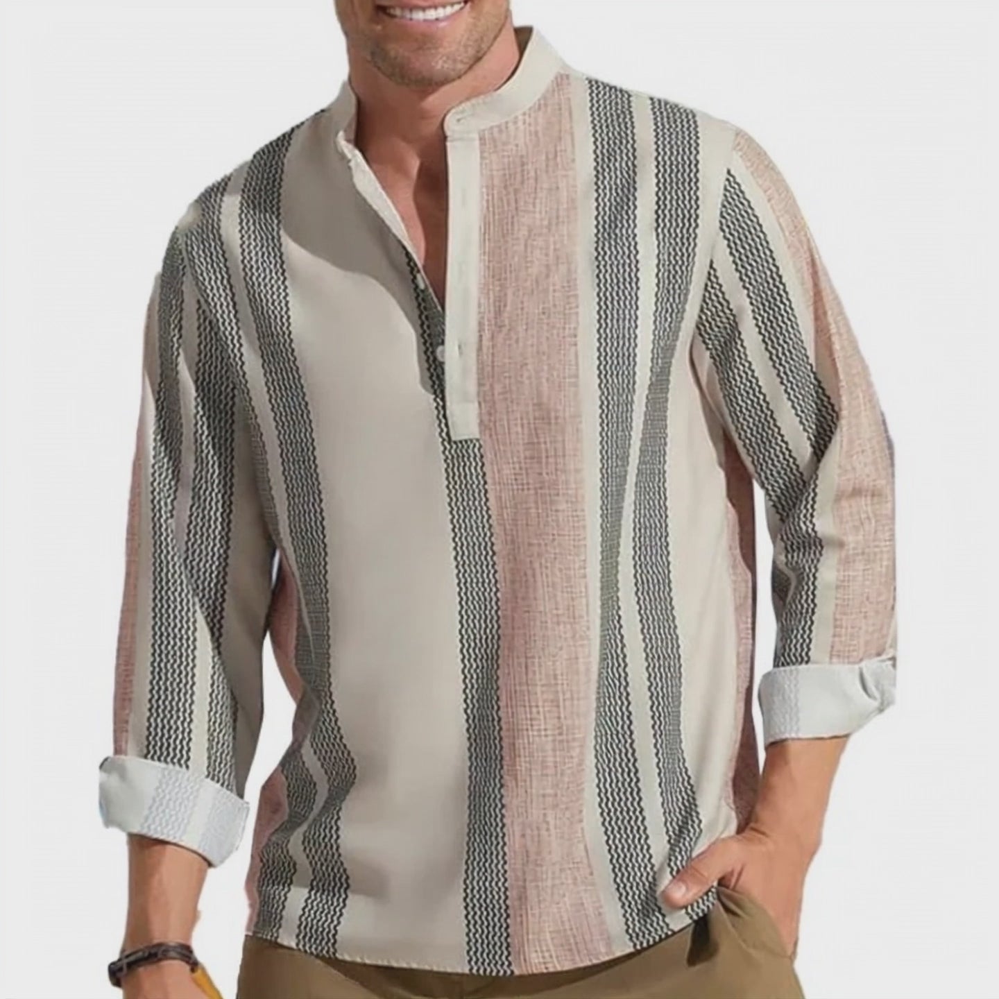 This Men's V-neck Striped Print Loose Lapel Shirt is a perfect blend of style and comfort. Made from a high-quality cotton-linen blend, it offers a breezy and soft feel ideal for casual and semi-formal occasions.
