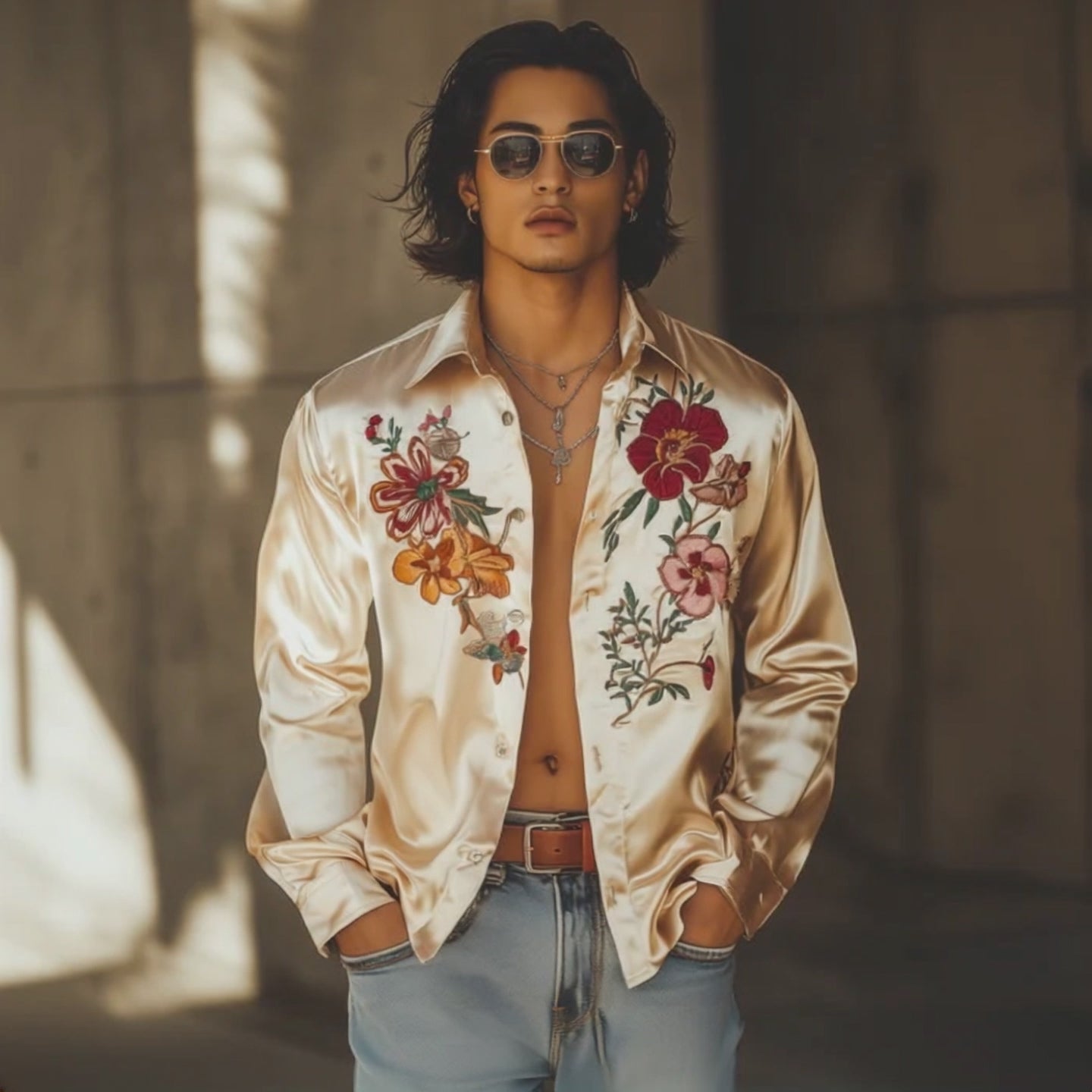 The Men’s Vintage Elegant Flower Embroidery Satin Lapel Loose Long Sleeve Shirt embodies timeless sophistication with a touch of artistic charm, making it an ideal choice for formal events, stylish gatherings, or vintage-inspired fashion. Crafted from smooth, high-quality satin fabric, this shirt features an elegant lapel collar, intricate flower embroidery, and a relaxed, loose fit. Its luxurious sheen and vintage design details create a refined aesthetic that elevates any wardrobe with a blend of classic elegance and contemporary flair.