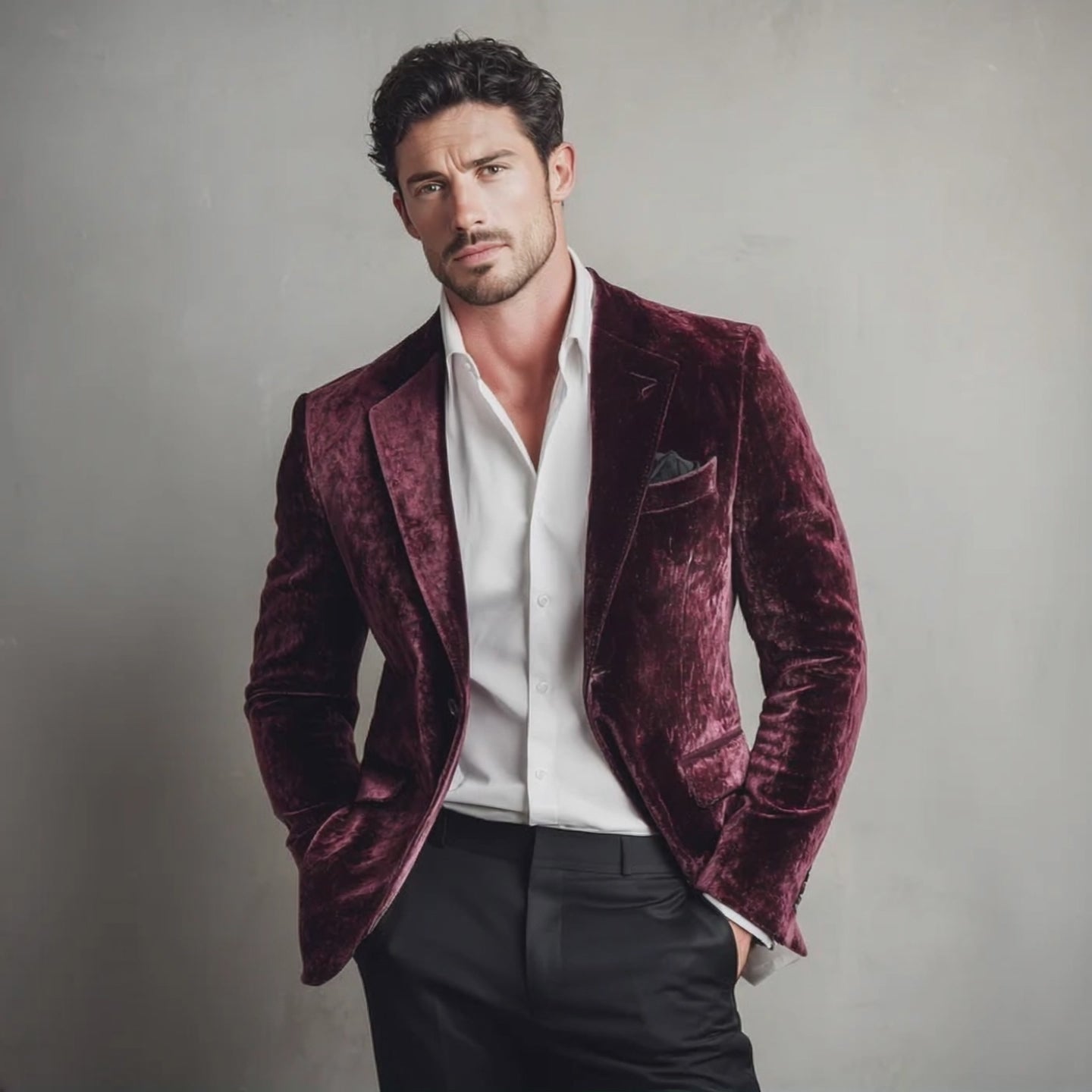 This velvet banquet blazer makes a bold statement when paired with tailored trousers in complementary or contrasting hues. For a classic look, opt for black or dark grey trousers. To add a touch of modern flair, style it with lighter tones or vibrant patterned shirts. Complete your ensemble with polished leather dress shoes and a silk pocket square for an elevated appearance.