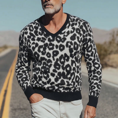 Men's Vintage Knitted Leopard Print V-Neck Sweater MTA1437H0P
