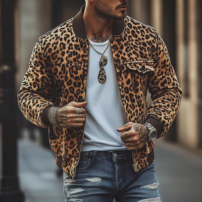 Introducing the Men's Vintage Leopard Print Chest Pocket Bomber Jacket, a statement piece that infuses bold fashion with a nostalgic twist. Crafted to perfection, this jacket merges iconic styling with modern sensibilities, making it a must-have addition to any fashion-forward gent's collection.
