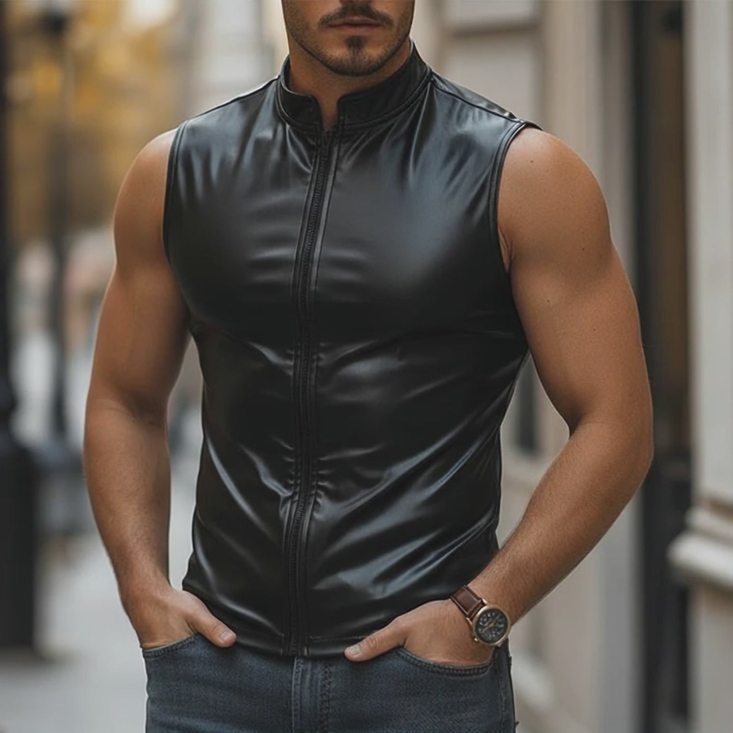 The Men's Vintage PU Faux Leather Zippered Sleeveless Vest is a striking piece of fashion that combines vintage aesthetics with modern functionality. Crafted from high-quality PU faux leather, this vest provides an edgy and timeless appeal suitable for various occasions.