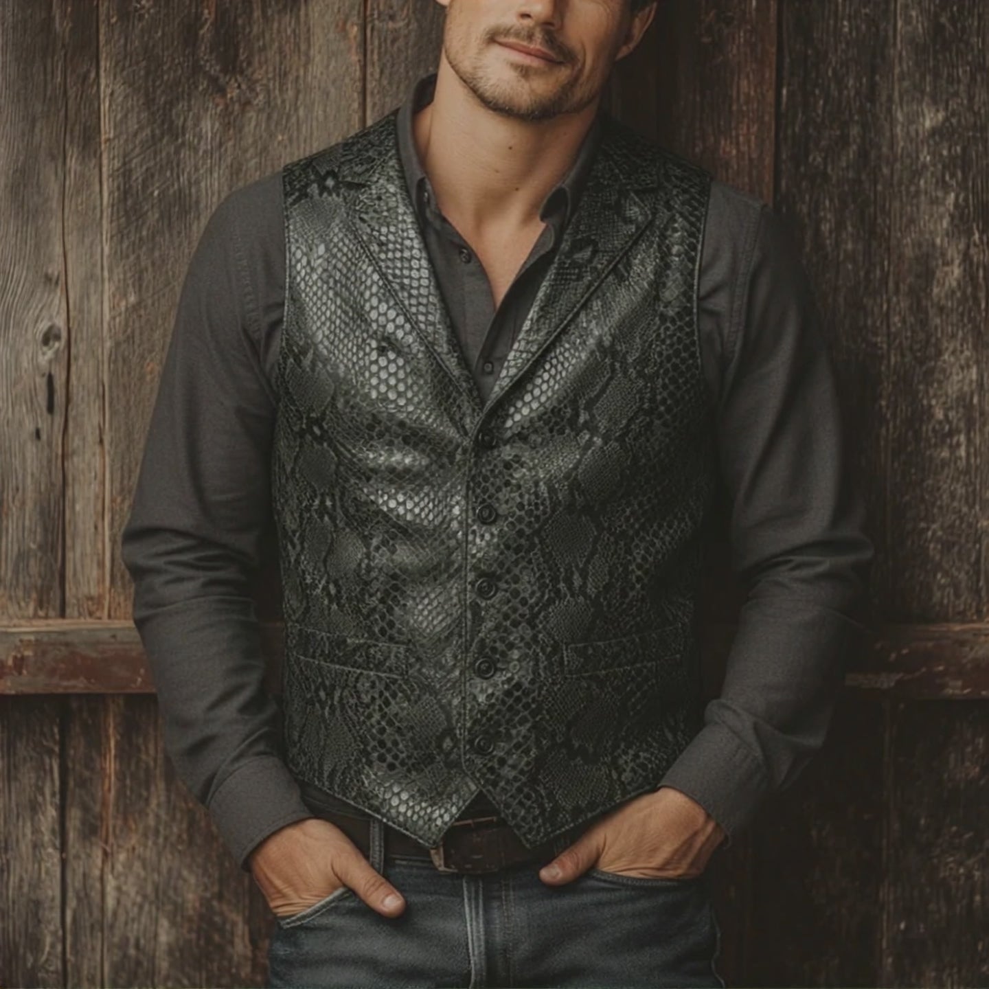 The Men's Vintage Snake-Print PU Leather Vest is more than just a piece of clothing—it's a statement. Perfect for those who dare to stand out, it combines vintage flair with contemporary style, making it a versatile piece that can elevate any outfit.