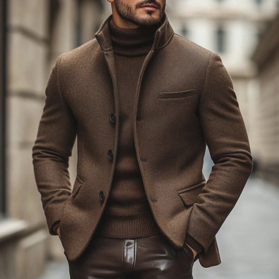The Men's Vintage Wool Blend Stand Collar Single Breasted Slim Blazer is a refined wardrobe staple that blends timeless vintage charm with modern tailoring. Made from a high-quality wool blend, this blazer is designed to offer warmth, style, and a flattering fit. Its stand collar and minimalist single-breasted design add a touch of sophistication, making it perfect for both casual and formal occasions.